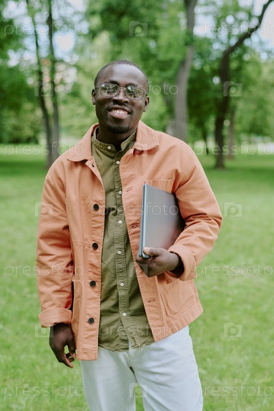 Портрет молодого взрослого чернокожего мужчины, улыбающегося и держащего ноутбук в парке