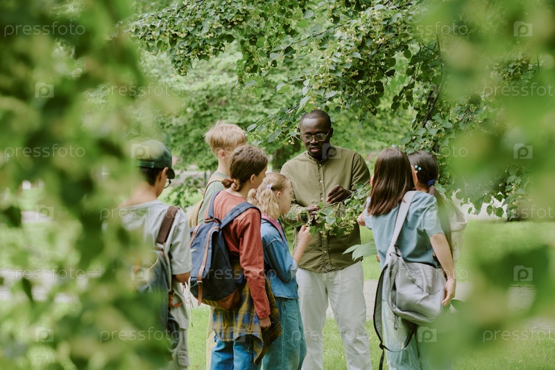 Учитель направляет разнообразную группу детей, исследующих природу в парке