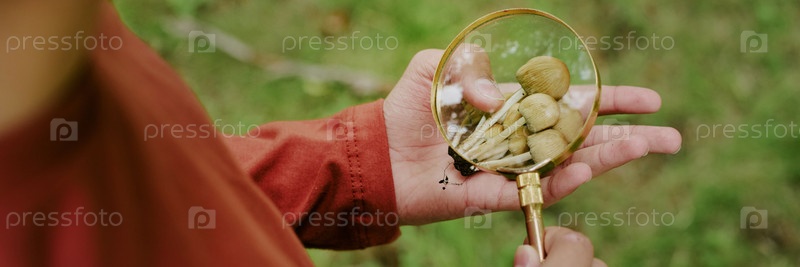 Ребенок, изучающий грибы с помощью увеличительного стекла во время занятий на открытом воздухе в школе