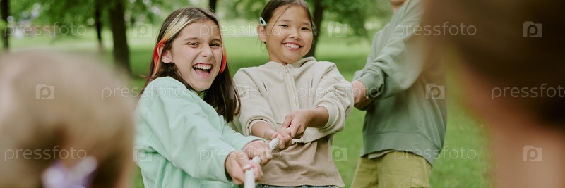 Многонациональные дети играют в буксировку войны на открытом воздухе в парке