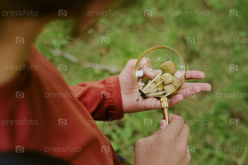 Ребенок, изучающий желуди с помощью увеличительного стекла во время активного обучения на открытом воздухе