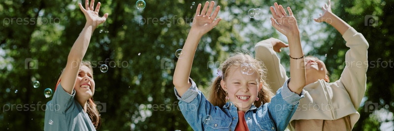 Дети смеются и играют на свежем воздухе с пузырями в парке