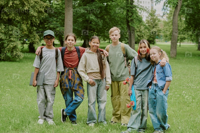 Группа разнообразных детей, стоящих вместе со школьным учителем в парке