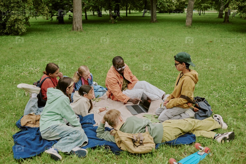 Мультиэтническая школьная учительница направляет детей к обучению на открытом воздухе в парке