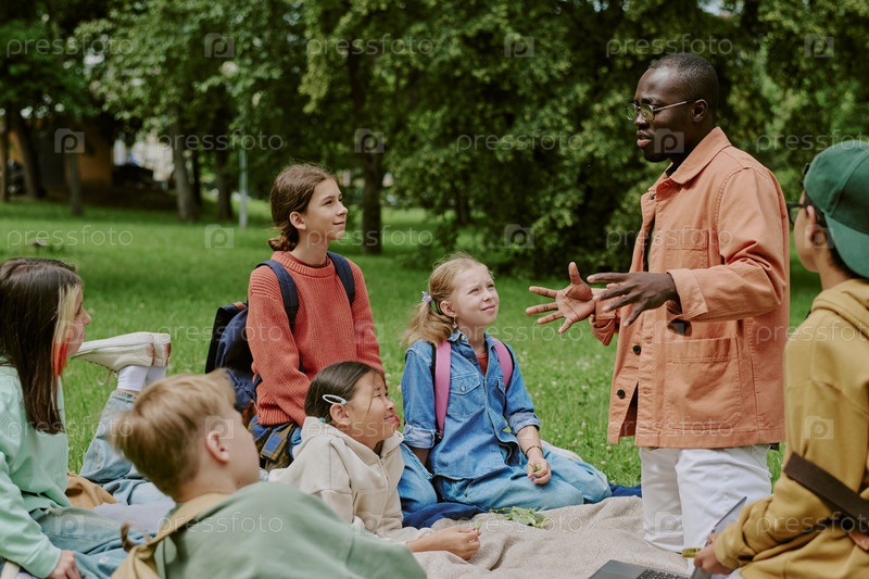 Учительница из разных школ привлекает многонациональных детей во время уроков на открытом воздухе