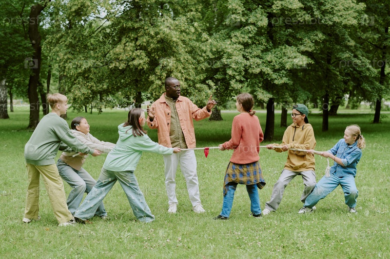 Мультиэтнические дети и молодые взрослые мужчины учитель играют в буксирующую войну на открытом воздухе