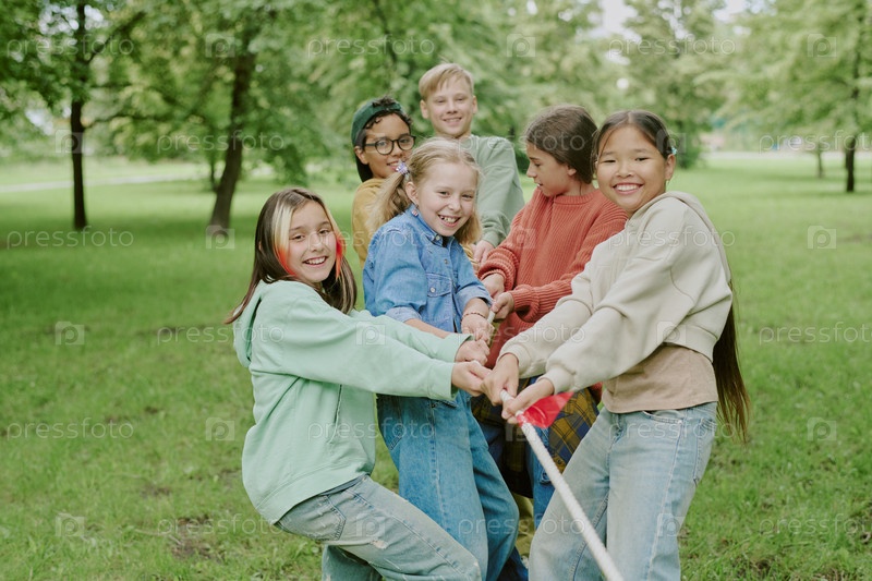 Мультиэтническая группа детей играет в буксир войны на свежем воздухе