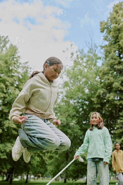 Многонациональные дети играют в прыжки по веревке со школьным учителем на открытом воздухе в парке