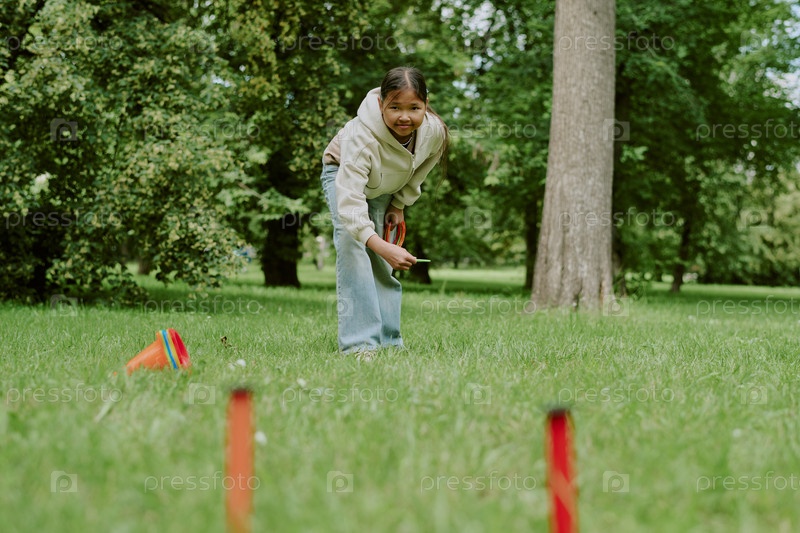 Азиатский ребенок бросает кольцо на улице во время школьной деятельности с учителем в парке