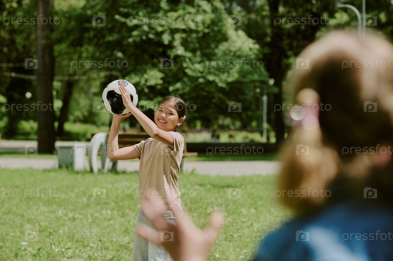 Улыбающаяся азиатская девушка бросает футбольный мяч другу в парке