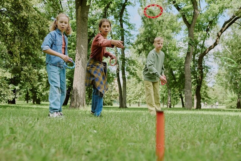Группа детей, играющих в игру ринг-тосс на открытом воздухе