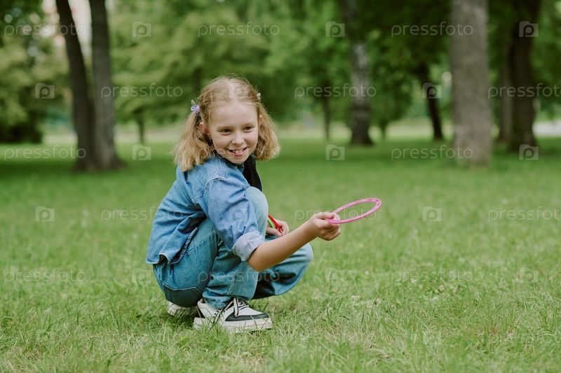 Девочка играет с игрушками на открытом воздухе в парке во время школьной деятельности