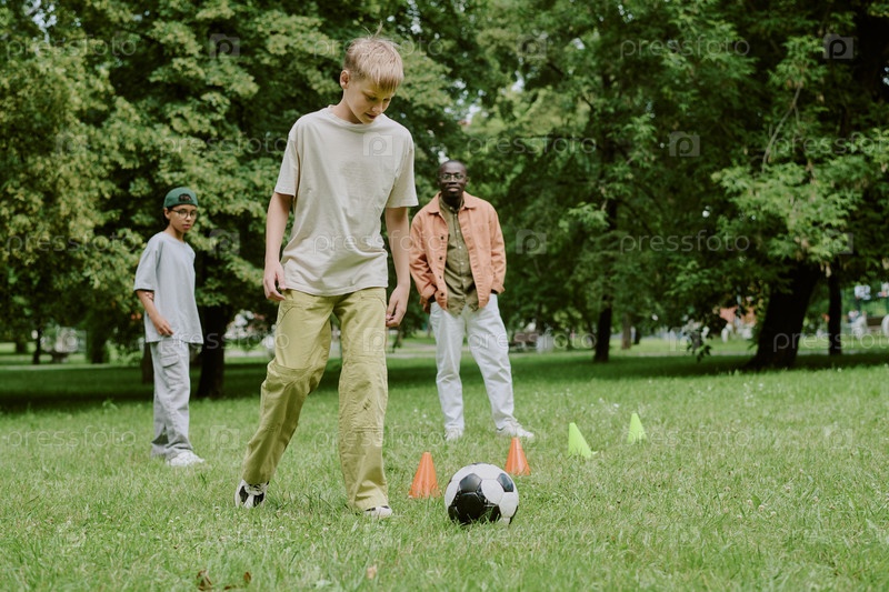 Учитель многоэтнической школы контролирует детей, играющих в футбол в парке