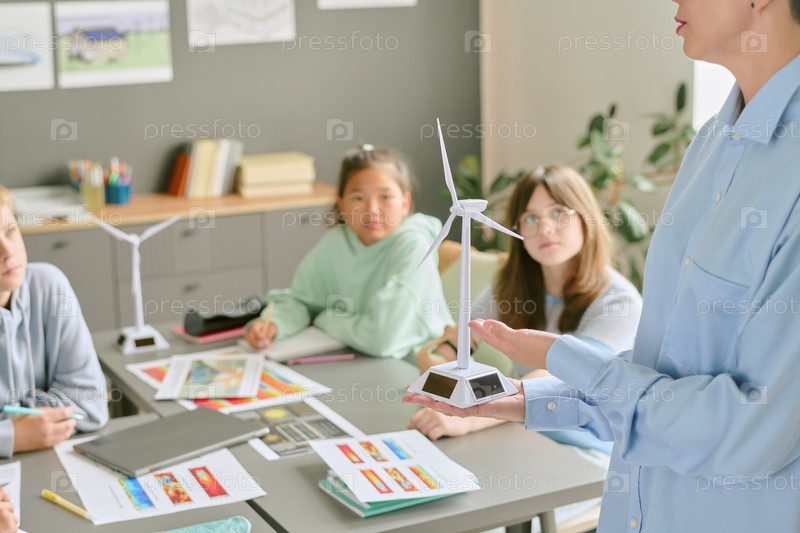 Женщина среднего возраста демонстрирует модель ветряной турбины подросткам