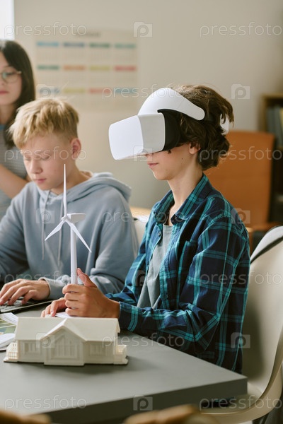 Мальчик-подросток использует гарнитуру виртуальной реальности, держа модель ветряной турбины