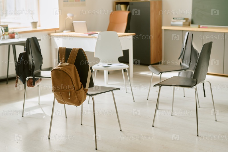 Пустой класс показывает рюкзаки, висящие на стульях во время школьного дня