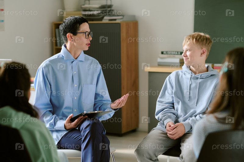 Подросток слушает женщину средних лет, объясняющую в классе