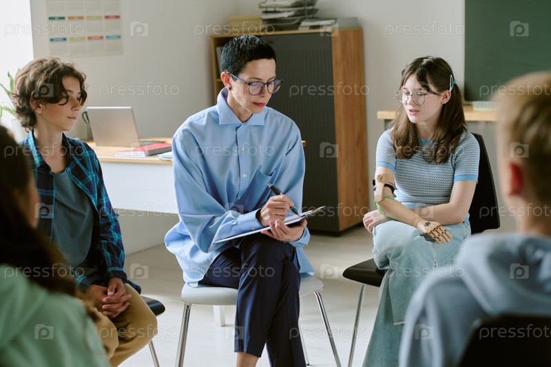 Психолог среднего возраста ведет групповую сессию терапии с подростками