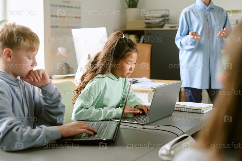 Азиатская девочка-подросток использует ноутбук во время учебы в классе со своими одноклассниками