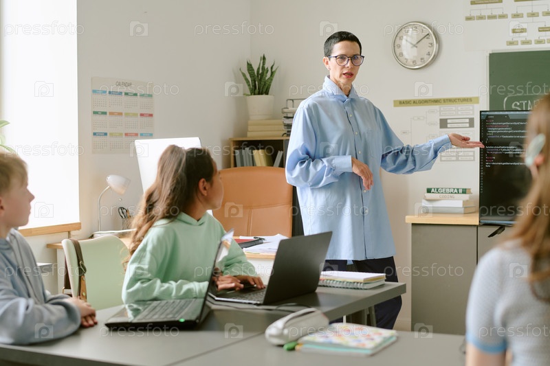 Женщина среднего возраста преподает различным подросткам компьютерное программирование