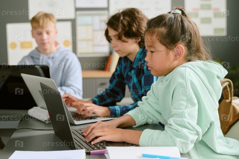 Учащиеся-подростки сотрудничают на ноутбуках во время занятий по обучению в классе