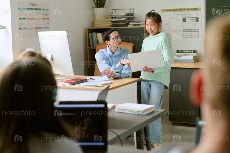 Азиатская девочка-подросток представляет свой проект учительнице в классе