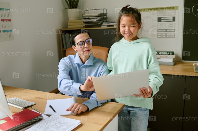 Женщина средних лет учит улыбающейся азиатской девушке пользоваться ноутбуком