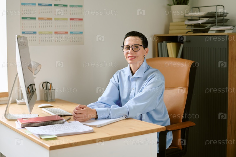 Портрет женщины среднего возраста, сидящей за рабочим столом и уверенно улыбающейся