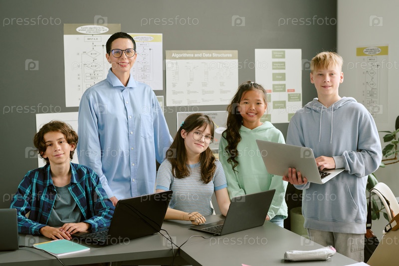 Группа разнообразных подростков, сотрудничающих на ноутбуках в классной обстановке