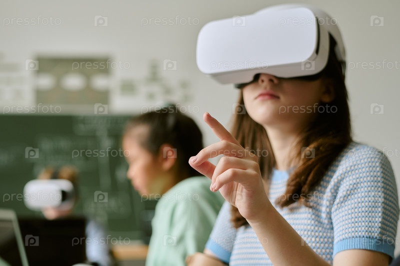 Девушка-подросток использует гарнитуру виртуальной реальности в классной обстановке