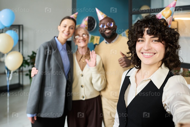 Разнообразная группа молодых взрослых и пожилая женщина, празднующая выход на пенсию с улыбкой