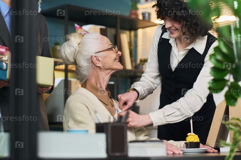 Пожилая женщина улыбается, получая подарок на день рождения от молодого взрослого