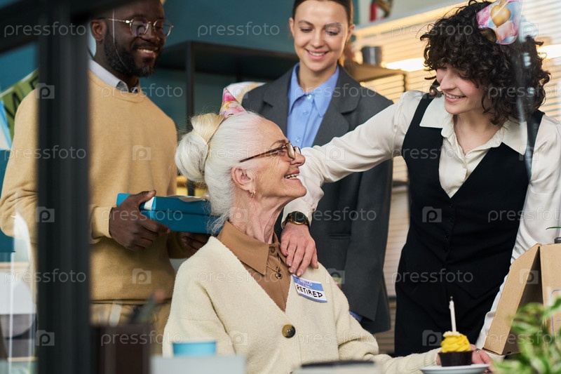 Старшая женщина улыбается, пока коллеги празднуют вечеринку по уходу на пенсию