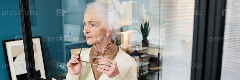 Старшая женщина, стоящая в помещении и размышляющая о жизни на пенсии