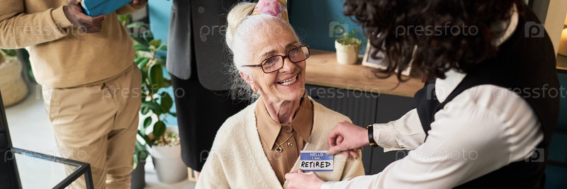 Старшая женщина улыбается, получая значок имени пенсионера в помещении