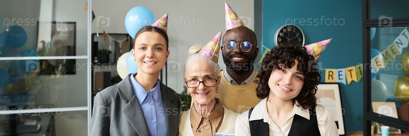 Мультиэтническая группа взрослых и пожилая женщина празднуют выход на пенсию в помещении