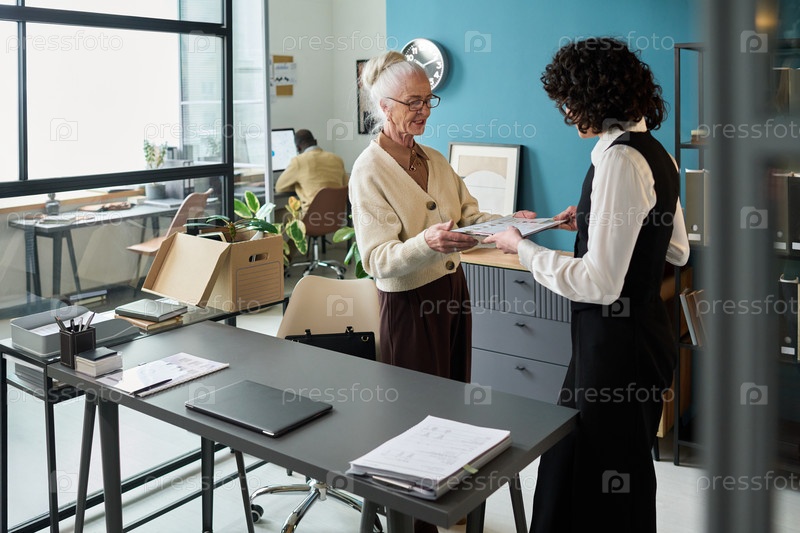 Женщина, вручающая документы молодой взрослой женщине в офисной обстановке
