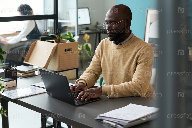 Чернокожий мужчина работает на ноутбуке в пенсионном возрасте Офисная обстановка студии Senior