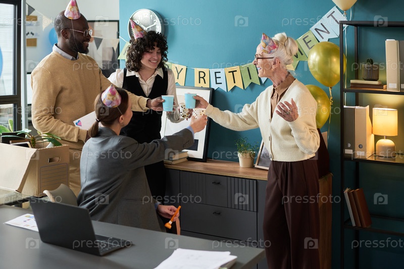 Женщина-старший празднует выход на пенсию с различными коллегами в офисе