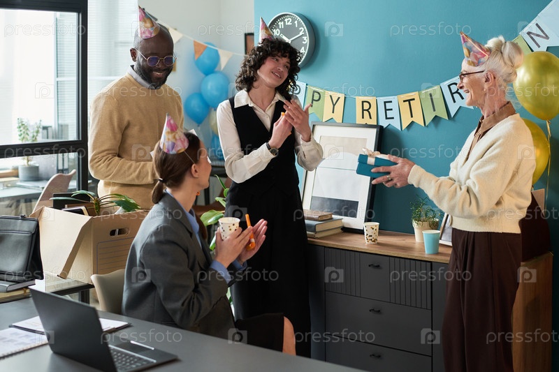 Разнообразные коллеги среднего и старшего возраста празднуют выход на пенсию в студии