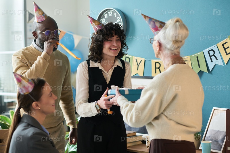 Мультиэтническая группа празднует вечеринку выхода на пенсию и дарит подарок пожилой женщине