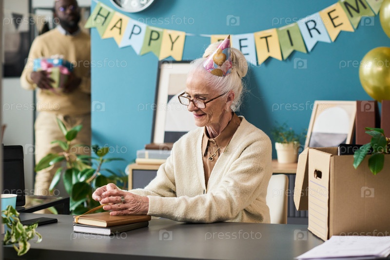 Старшая женщина улыбается во время празднования выхода на пенсию в студии