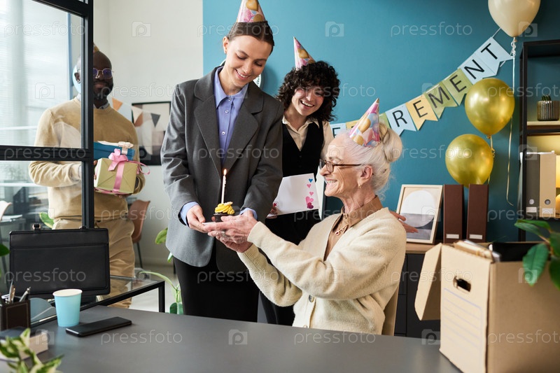 Старшая женщина получает кексы во время празднования пенсионного офиса
