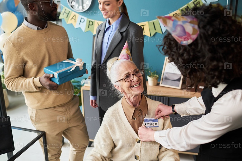 Женщина улыбается, когда празднует выход на пенсию со старшими коллегами