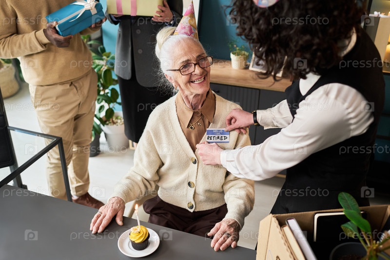 Старшая женщина улыбается, получая значок выхода на пенсию во время празднования