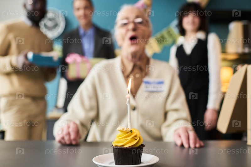 Старшая женщина дует в свечу во время празднования выхода на пенсию