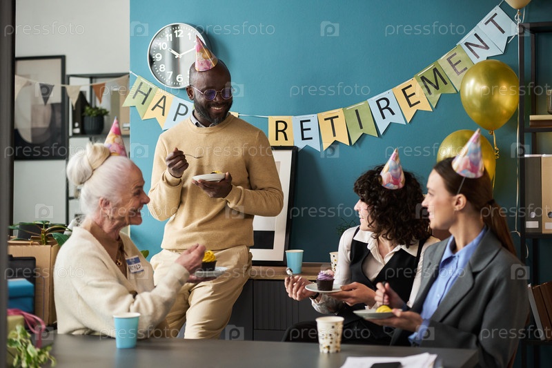 Старшая женщина и разнообразные коллеги празднуют вечеринку по уходу на пенсию