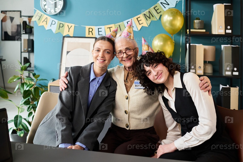 Старшая женщина обнимает молодых взрослых женщин во время пенсионного собрания