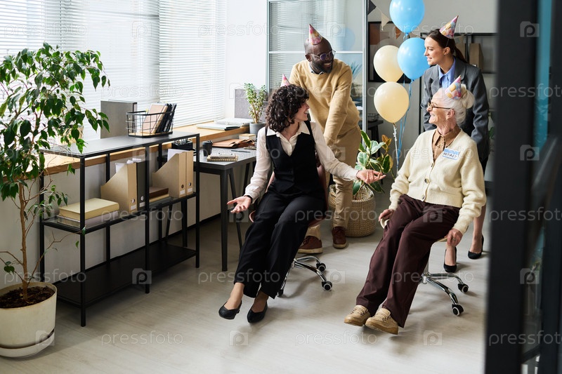 Женщина-старший и разнообразные коллеги празднуют выход на пенсию в помещении
