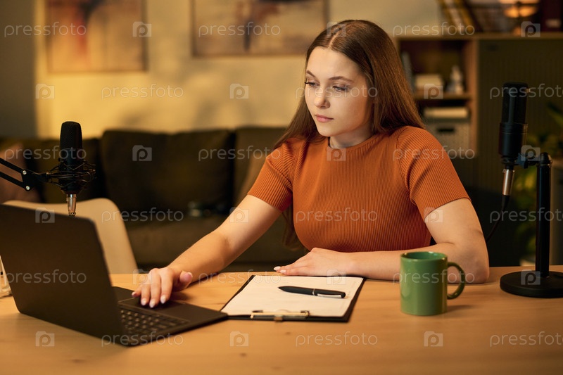 Подростка записывает подкаст с ноутбуком и микрофонами в помещении
